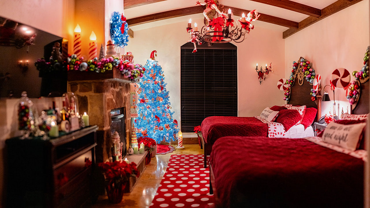 Peppermint wishes and candied dreams await all who stay in the Mrs. Kringle Suite. The room boasts two sparkling Christmas trees, tabletop adornments, room decorations, and holiday-themed furniture complete with seasonal velvet bedding and pillows.
