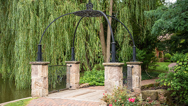 The stone arch is located between the Tuscan Pavilion and the sparkling lake. In the spring and summer months this spot is accented with beautiful flowers. Willow trees add another striking element to the background.
